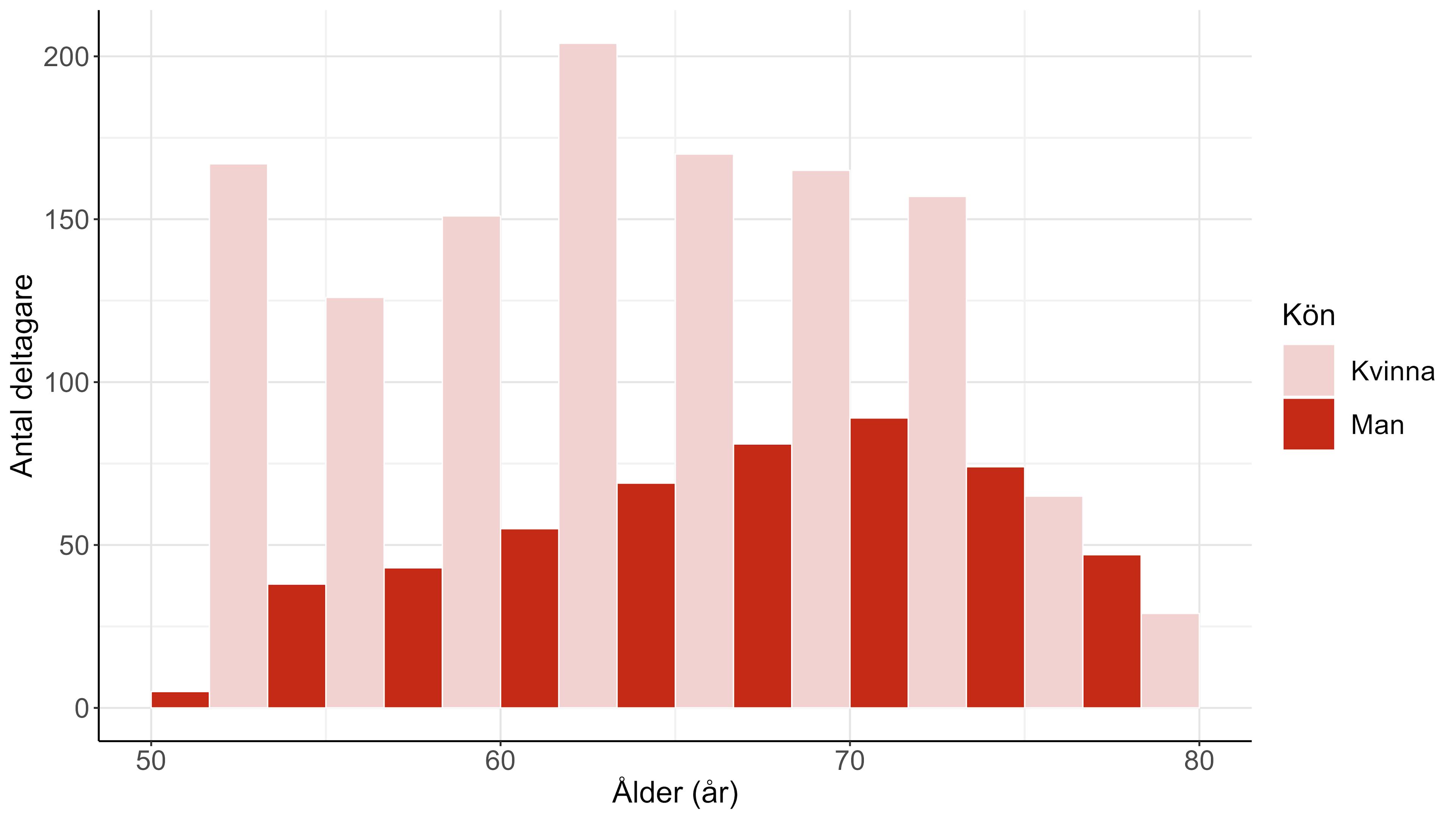 Figuren visar ålders- och könsfördelningen bland deltagare som har gjort minst Steg 1 i Studiedel 2. Ljusrosa staplar visar antalet kvinnor och mörkröda staplar visar antalet män i varje åldersintervall mellan 50 och 80 år. Staplarna är grupperade per kön så att man kan se skillnaden mellan kvinnor och män inom varje åldersgrupp. Detta är intressant eftersom man för att resultaten ska bli representativa helst vill ha en jämn fördelning över olika åldersgrupper och kön.