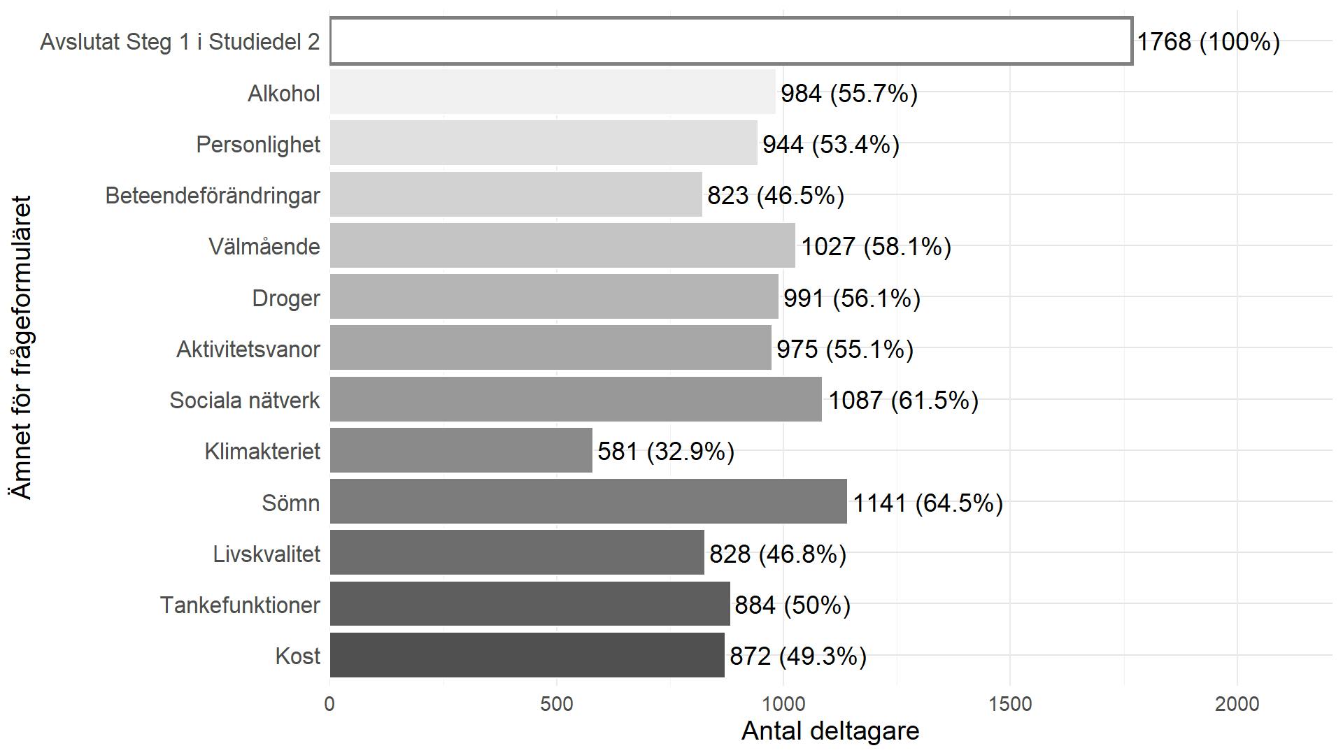 Figuren visar hur många deltagare som har svarat på olika livsstilsfrågeformulär i Studiedel 2. Staplarna visar antalet deltagare per formulär, och siffrorna på staplarna anger både absolut antal och procent i relation till de som har Avslutat Steg 1 i Studiedel 2.
