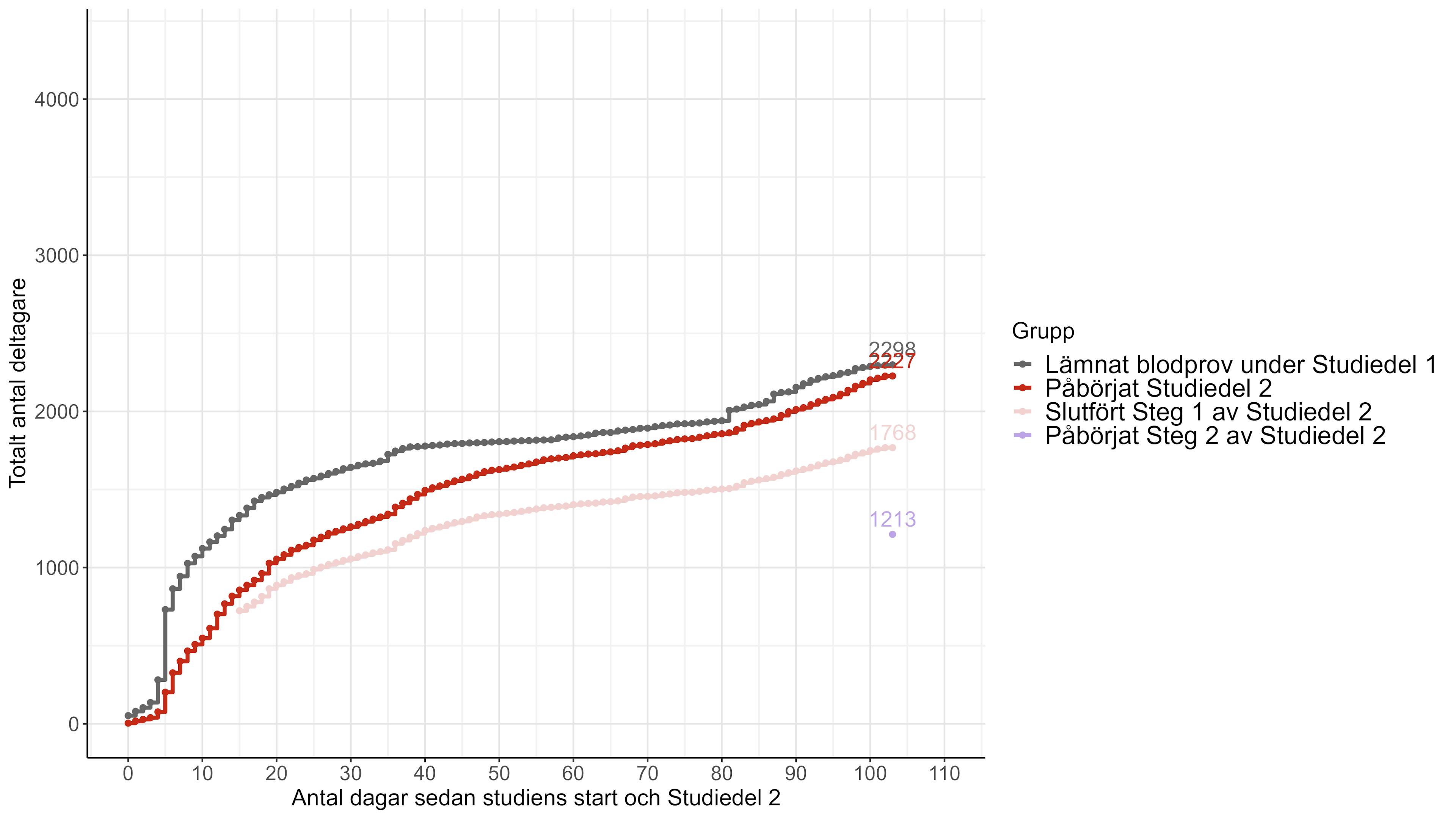 Figuren visar hur många personer som deltar i studien över tid. Den mörkgrå linjen visar de som har gjort alla steg under Studiedel 1 (kärngruppen). Den röda linjen visar de som har påbörjat Studiedel 2, och den rosa linjen visar de som har avslutat Steg 1 i Studiedel 2. Den lila punkten visar antalet deltagare som har påbörjat Steg 2 i Studiedel 2; denna data finns inte per dag utan anges endast som slutgiltigt antal. Dag 0 är startpunkten för respektive Studiedel, och linjerna visar hur deltagarna stegvis fullföljer studiens steg. Allteftersom tiden går kommer vi att uppdatera denna graf varje vecka och se hur antalen utvecklas.